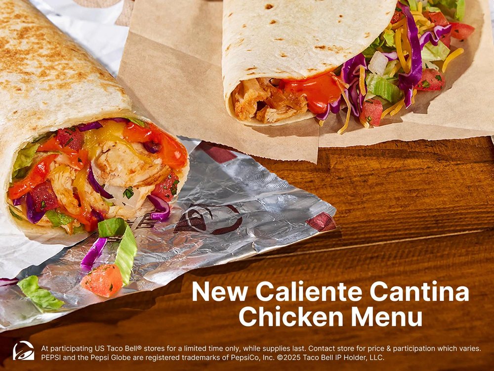 - Caliente Cantina Chicken Menu: Choose from tacos, burritos, or quesadillas featuring slow-roasted chicken and bold Caliente Sauce.